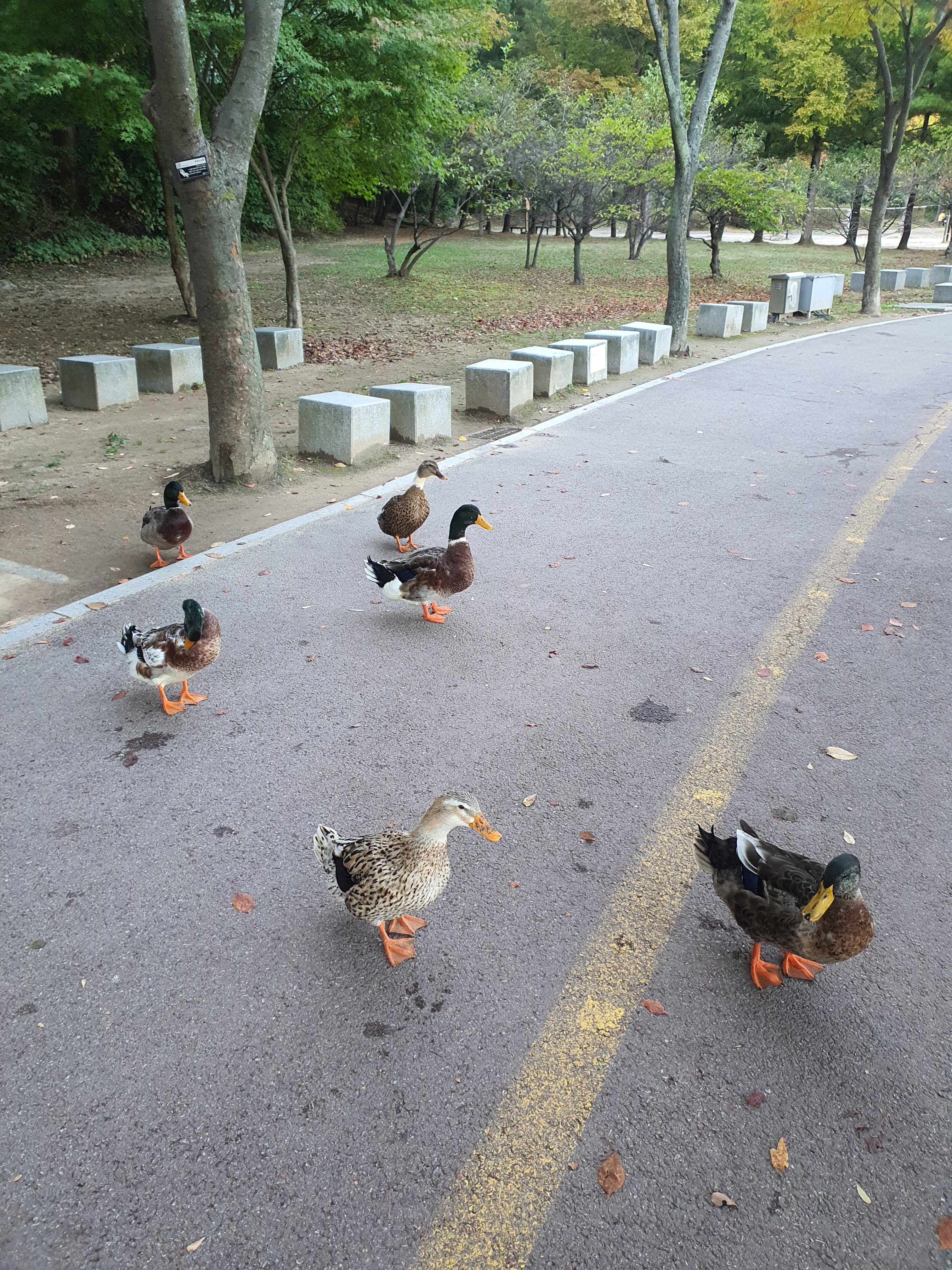 걷다가 아이들이 모여있어서 보니까 오리 여러 마리가 잠시 밖으로 나왔네요 ㅎㅎ