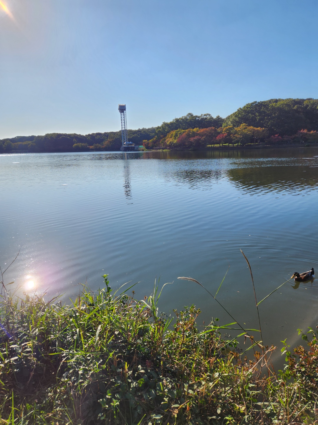 산책로가 정비가 잘 되어 있어서 예쁜 풍경을 담아보았습니다. 오리가 둥둥 떠 있고 물속을 들여다보면 물고기도 많이 돌아다녔어요. 며칠전 비가 와서 그런지 하늘도 맑고 날씨도 좋아서 나들이하기 정말 좋은 날씨였어요. 중간중간 의자도 많아서 잠시 앉아서 풍경을 바라보니 그림 같았어요