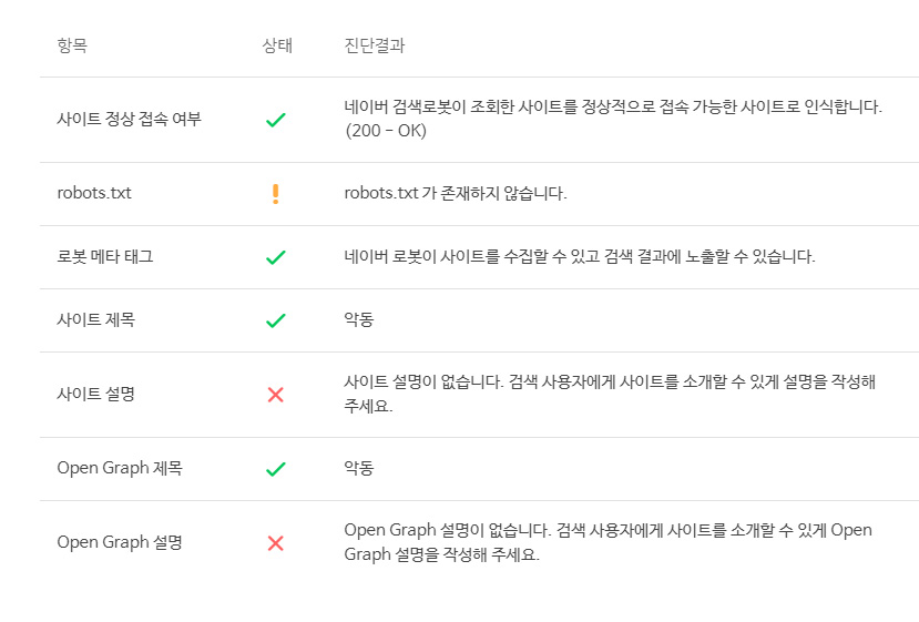 예전에는 그냥 RSS등록하면 보여줬던 것 같은데 이게 없어지고 웹마스터 도구라고 생겨서 사이트 진단을 해보니 결과는 이와 같음... 좀 찾아보니 오픈그래프, 사이트 설명은 메타로 등록하면됨