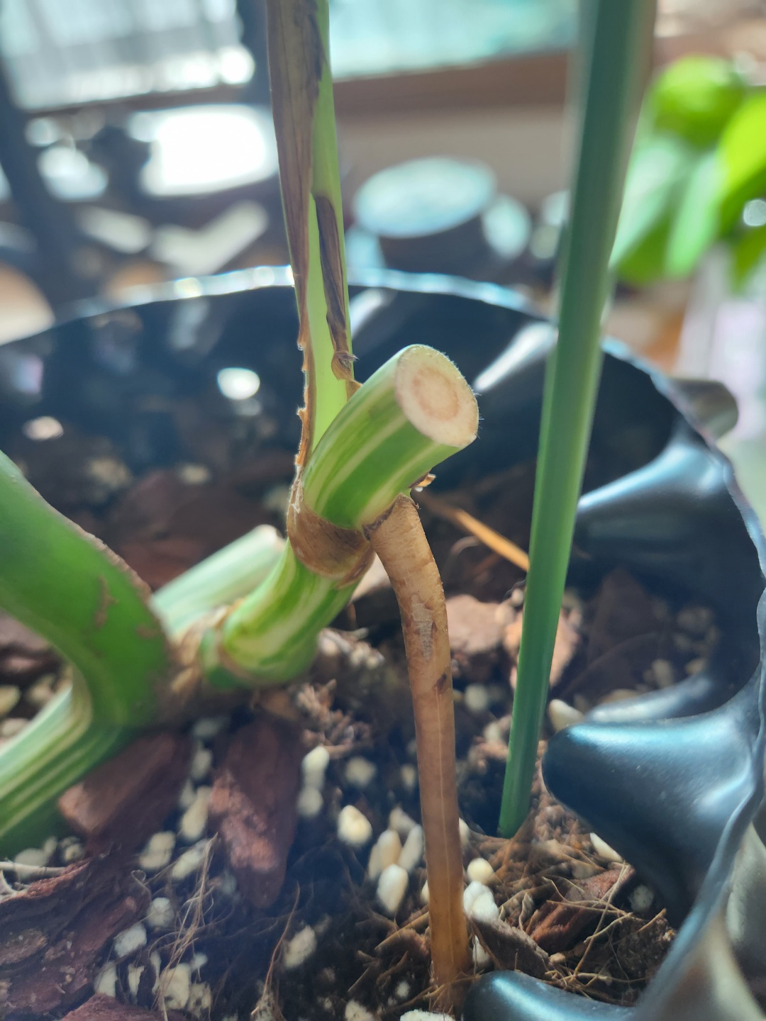 잘라낸 몬스테라 알보 탑삽수! 미들에서 잘라냈으니 저는 뿌리 가득한 기존 부분과 추가로 탑삽수가 생겼습니다.