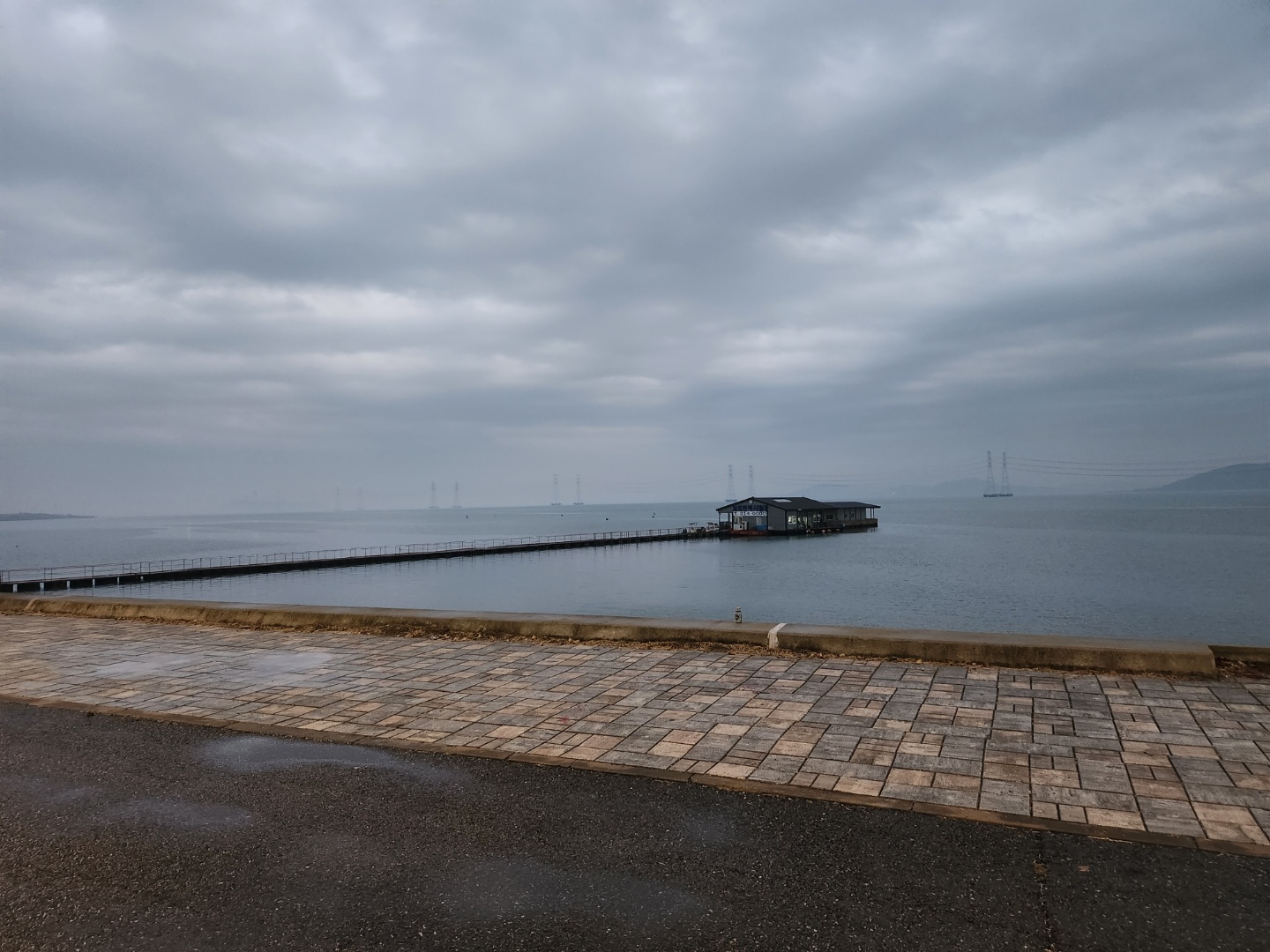 아직 바닥은 그대로 젖어있어요~ 비온 날 약간 젖은 바닥 그리고 가득한 안개 속에서 거북섬을 바라보니