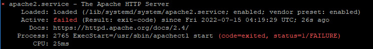 상태를 보니 apache2 가 실행이 안된다.