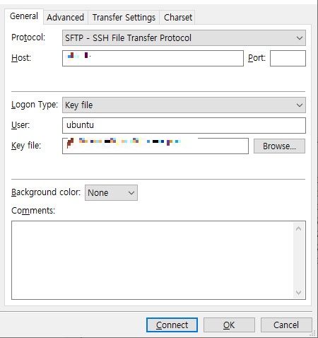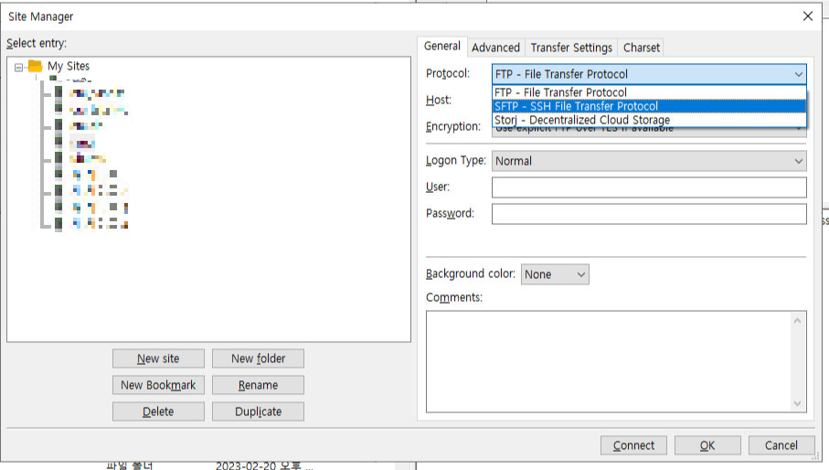 Protocol 기본 설정이 FTP로 되어 있는걸 SFTP로 변경